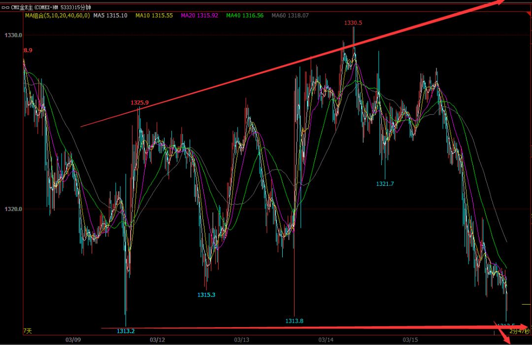 回顾周四的黄金价格走势,亚洲盘早间于此前小幅回落低位开盘,开盘再震荡上行至前期上沿高位附近,盘中多次上攻未果再次确认压力有效午盘转而快速下跌,直接下打至前日回落低位,欧盘后窄幅震荡,晚间美盘则再度快速下跌创低,有效突破,短期空头趋势进一步发展,目前低位已直接下打至前期宽幅震荡下沿的阶段性支撑区域,日内重点关注其下破情况,个人仍预计波段性空头可能性较大,即下破进一步发展更大级别的空头可能性较大,建议大家下破后继续放空为主,如图: